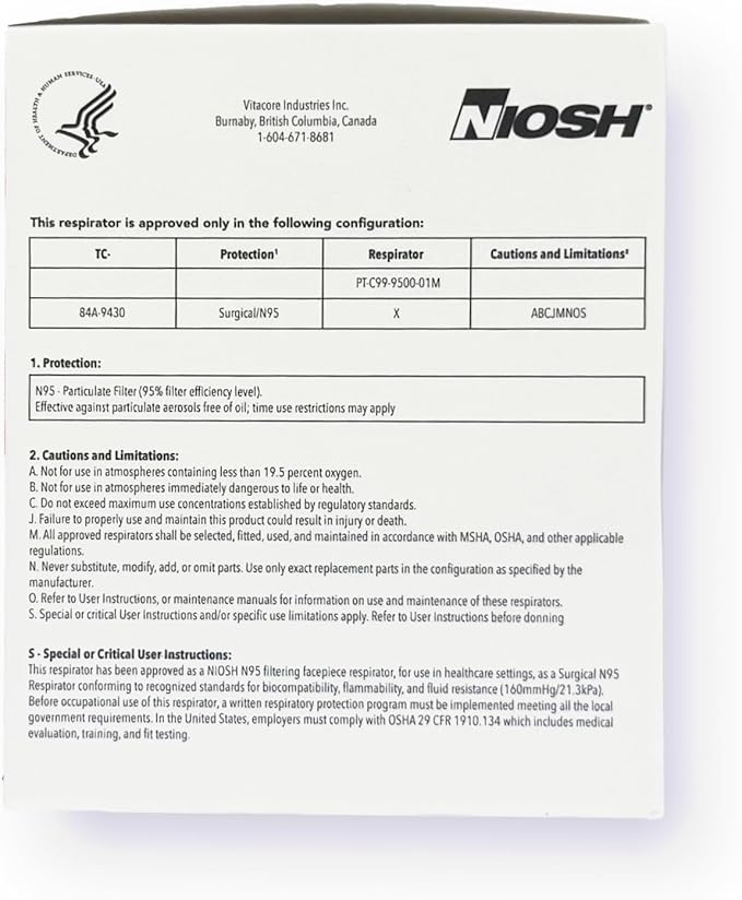 - NIOSH Certified N95 Surgical Respirator (PT-C99-9500-01M)